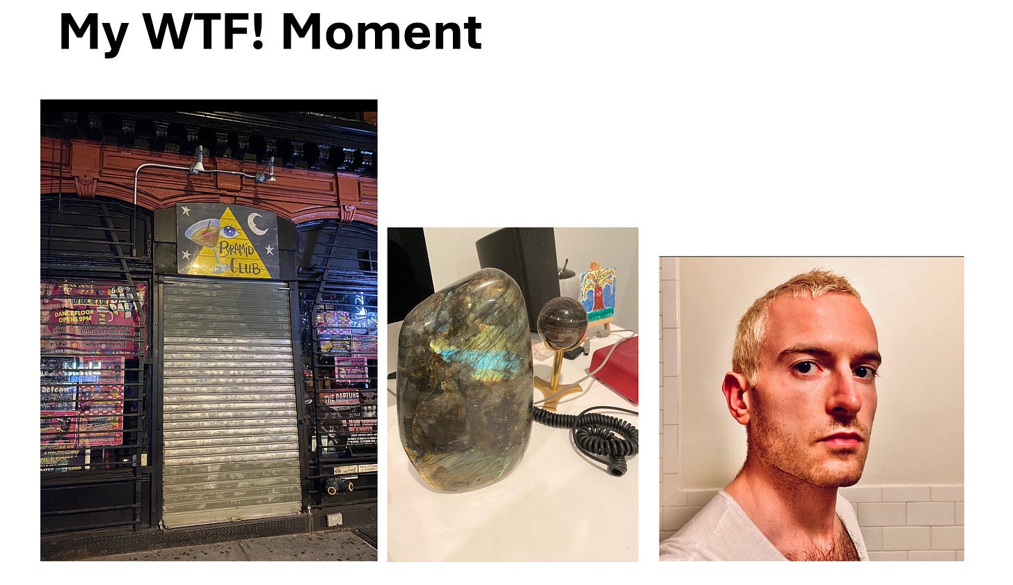 I was born in Minneapolis, grew up in Minneapolis. I was a skate punk and a musician. You can see that with the Arrest Me, I'm a Skateboarder shirt. Went to Northwestern, played in a band, majored in philosophy and economics. Moved to Manhattan, worked for Scott Galloway, Business Insider, did a bunch of business presentations, and it was a great time. But then I had a “what the fuck?” moment. I got a concussion at a nightclub. I started buying crystals and I bleached my hair. What was going on?