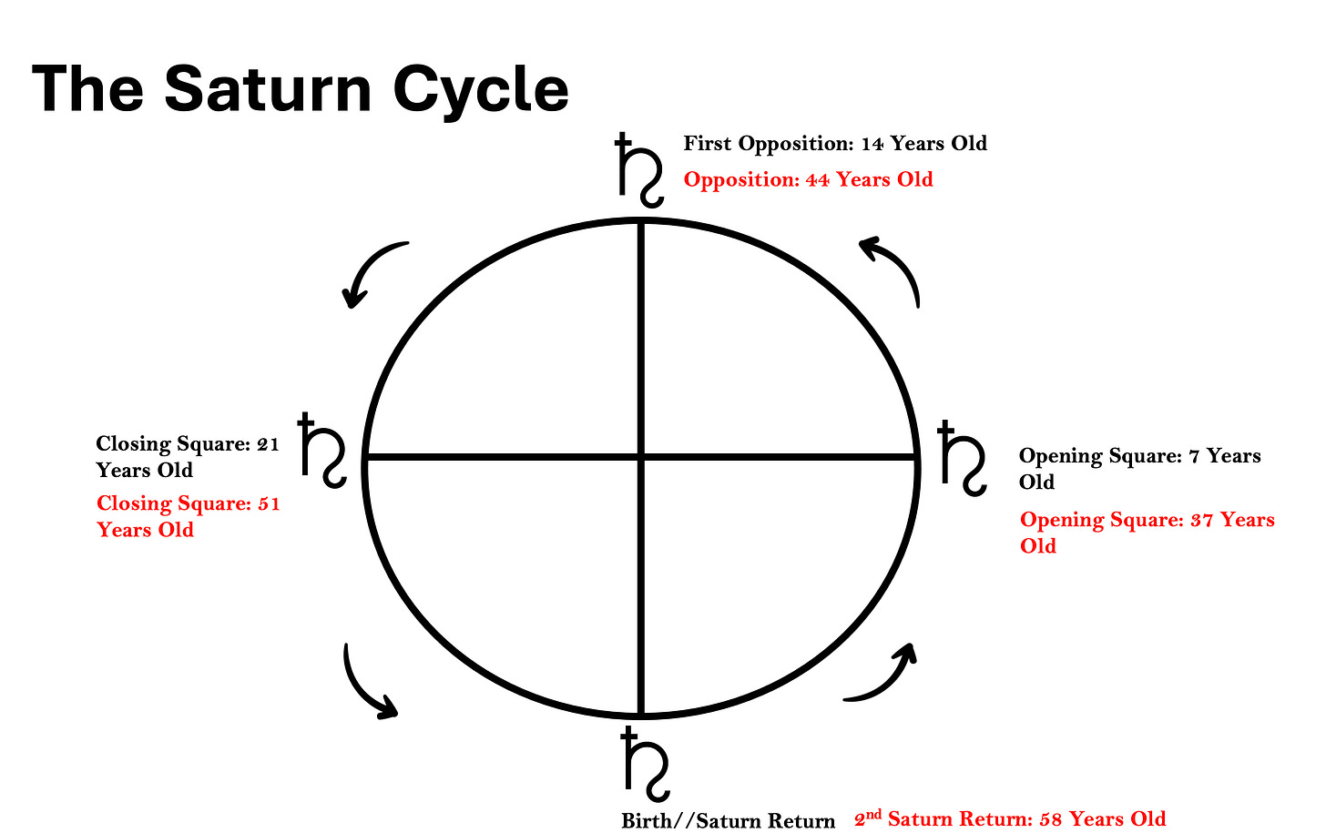 And then by 21, you have a closing Saturn square. That's when you really start to feel pressure to actually commit to some type of career or career path. That's usually towards the end of college. And then your Saturn return is around 28, and that's when a lot of people are faced with a big commitment that sets their trajectory truly for the next 28 years (the next Saturn Cycle). This is the broad overview of how the Saturn cycle operates.